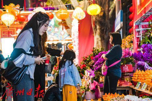 在江南东路口的花市门楼后,满墙的粉色鲜花,成为了来往游客的“游园背景板”,上前拍照打卡的街坊们络绎不绝。花市上游人如织、人声鼎沸,多家摊位店主带来了各种各样的年货商品,让街坊们挑花了眼;年花摊位上各种鲜花争奇斗艳,再加上特意设计的灯笼灯光,现场氛围感满满。