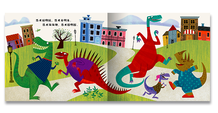 摇摆的恐龙、跳跃的恐龙、咧嘴大笑的恐龙、仰天咆哮的恐龙……绘者将一只只穿着睡衣的恐龙描绘得异常生动可爱,它们仿佛一群调皮的小伙伴,让孩子感到无比亲切,家长在睡前可以和孩子一起边读边进行肢体互动。随着故事情节的推进,营造出浓厚的睡眠氛围,将带领孩子进入甜美的梦乡。热闹非凡的场面,也非常适合在幼儿园进行“睡衣派对”表演。