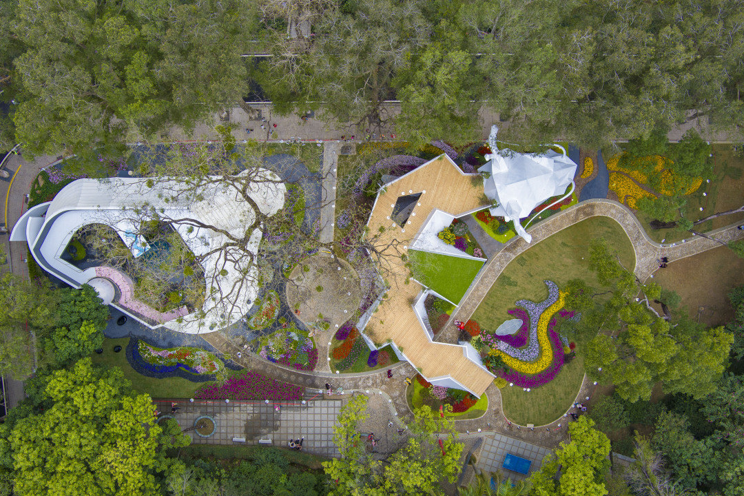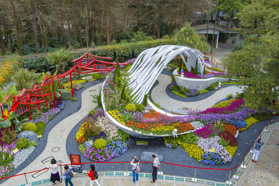 这里,岭南园林艺术,焕发新活力。在枝繁叶茂、峰峦重叠、溪涧纵横的白云山上设计作品,不得不说是一个“极具挑战性”的任务,健行云山,可以看到展示云山珠水城市特点,浮岛青葱,流水潺潺的《鸟屿浮岛》作品,有呈现岭南建筑风格线条,结合丹顶鹤与丹青图元素的《丹凤朝阳》作品,更有结合白云山地貌,结合浪漫的岭南民俗神话的《鳌鱼跃花海》等等,与白云山的文化内涵、地理特征有机结合,以繁花献礼广州,以诗意装点绿美云山。