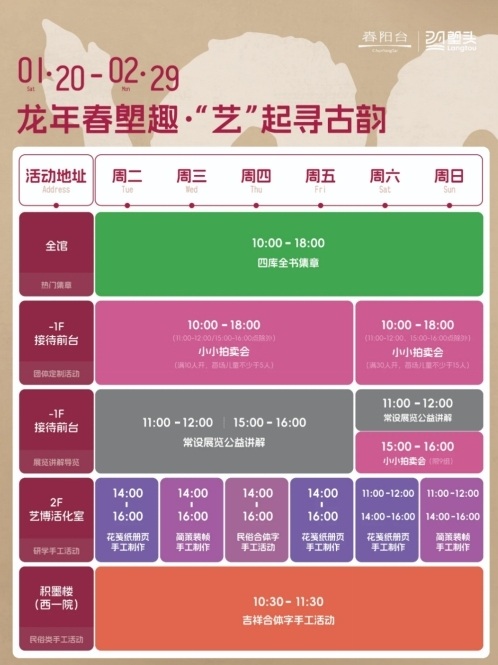 吉祥合体字手工活动、研学手工活动(花笺纸册页/简策装帧/民俗合体字)、四库全书集章打卡、常设展公益讲解、小小拍卖会。