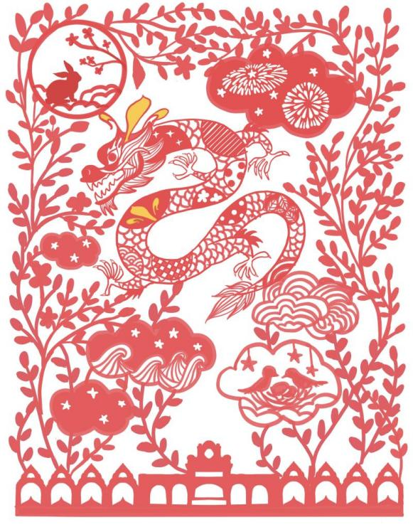 据悉,此次活动佛罗伦萨小镇首次携手中国著名剪纸艺术家邱珈打造龙年特别艺术IP,为消费者打造精彩纷呈的新春节日盛宴。邱珈擅长创作梦幻、优美且充满童趣的剪纸作品,在过去十多年间,她与众多国际知名品牌展开了艺术合作,包括TASAKI、Sephora、Luxottica等。此次,佛罗伦萨小镇特邀其以生肖龙为主题灵感,将抽象的意式建筑作为画面基础,结合中国传统文化中的天干地支五行风水,森林意象,一年四季来连接各种画面元素,春天的鸟巢、夏夜的海浪、仲秋的圆月和冬季的烟花……四季的梦幻风景映射于云朵;通过“鸢尾花龙”的形象展现佛罗伦萨小镇的时尚业态,不同于一般的全身鳞片的龙的形象,这条龙身着各式时髦印花,浑身布满格纹波点星星海波等时尚纹样,更以金色的佛罗伦萨小镇品牌Logo鸢尾花作为峥嵘头角,以精湛的传统艺术手法,表现剪纸艺术意蕴的同时,体现小镇 “新年有意思”的主题。