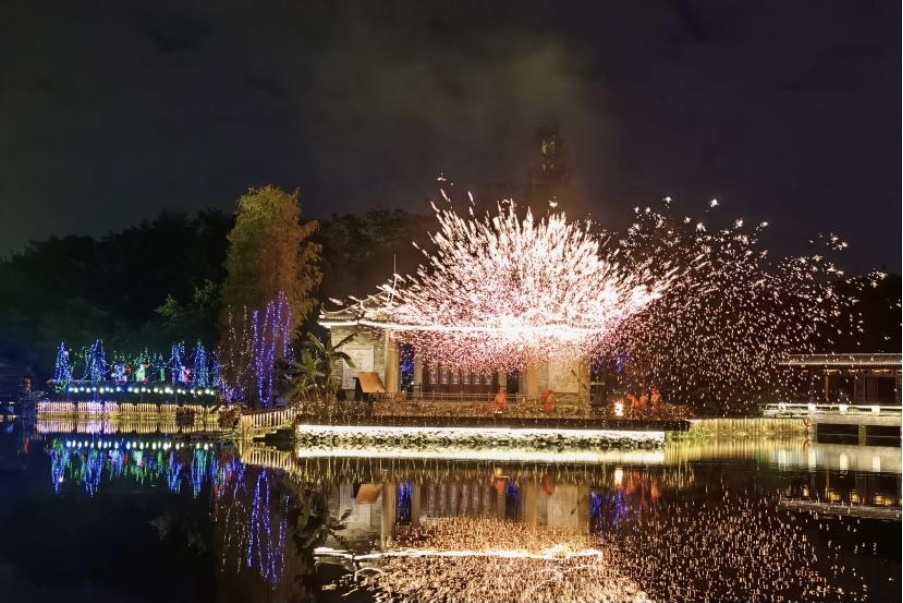 祭海大典、南国庙会、花满人间、河灯祈福、老祠堂、比武招亲、斗谜大会、众仙送福、花灯大巡游等场景历历在目,一连串沉浸式情景演绎轮番上演,让人应接不暇,瞬间被带入南国小镇话本。春节假期,更有庙会“蹦迪”、打铁花、斗鸡等民俗表演,约上亲朋好友共赴这场南国民俗盛典吧!