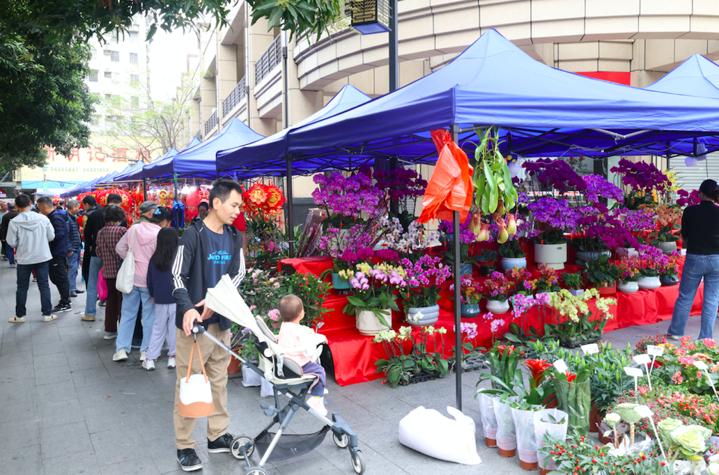 值得注意的是,今年的花市沿素社街人流最为密集的万寿路沿线设置,既方便来往居民顺道购买,也方便本地街坊下楼就能逛花市、买年货。
