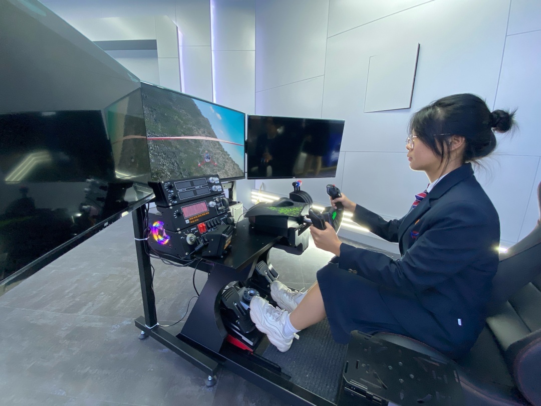 邝维煜纪念中学的同学在体验模拟飞行。
