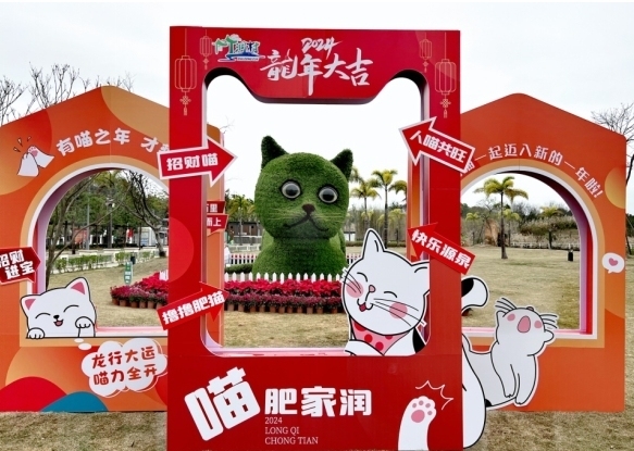 滨湖草坪旁,微风徐来,一个灵动有趣、精致玲珑、活泼可爱的猫咪立体绿雕映入眼帘、吸人眼球,充满无限生机与活力,正成为竹洞村一个景观符号,新春最亮眼的“显眼包”。