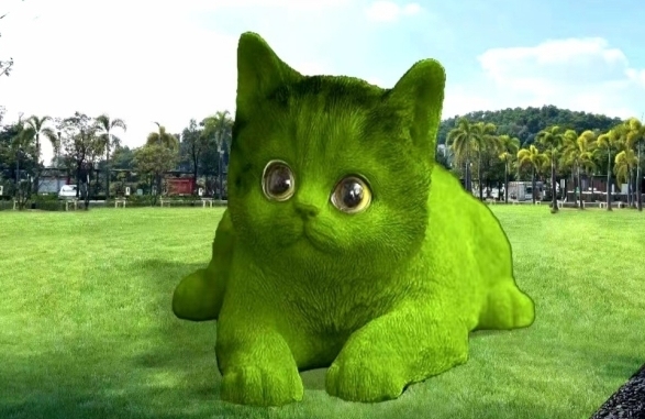远处俯瞰,这只高4米,长8米的神兽“绿巨猫”,憨态可人,尖尖的耳朵,圆溜溜的眼睛,柔软和可爱的身体富有丰富的艺术场景气息。