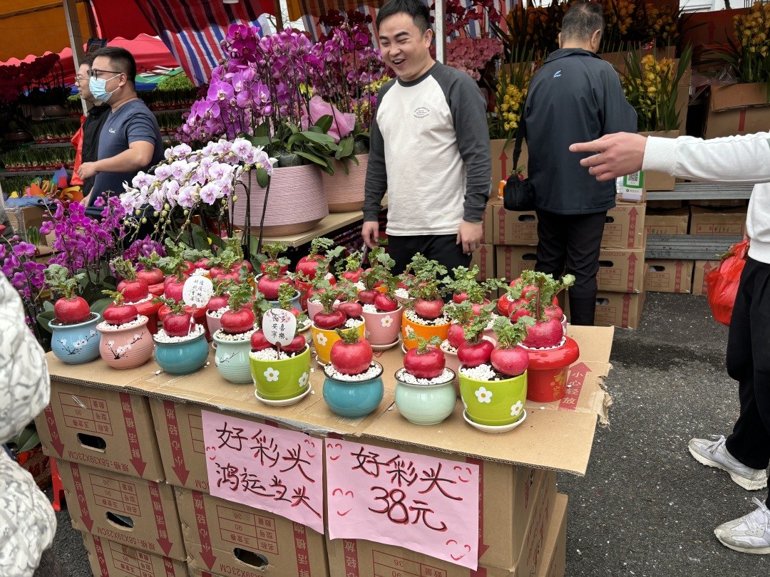 逛花街的街坊纷纷表示,今年花市花更艳、味更浓。“今年很多新鲜的花,很多都没见过。”在天河上班的邓女士,中午跟同事一起到附近的天河花市逛了一圈,她花38元买了一扎“珍珠梨花”,“没见过,所以想买来试试。还有这个红色的萝卜,说是观赏性萝卜,名字叫‘好彩头’,很特别!”