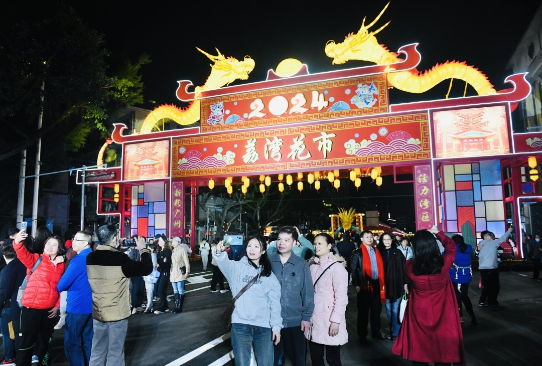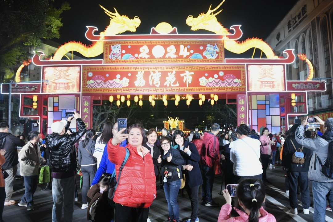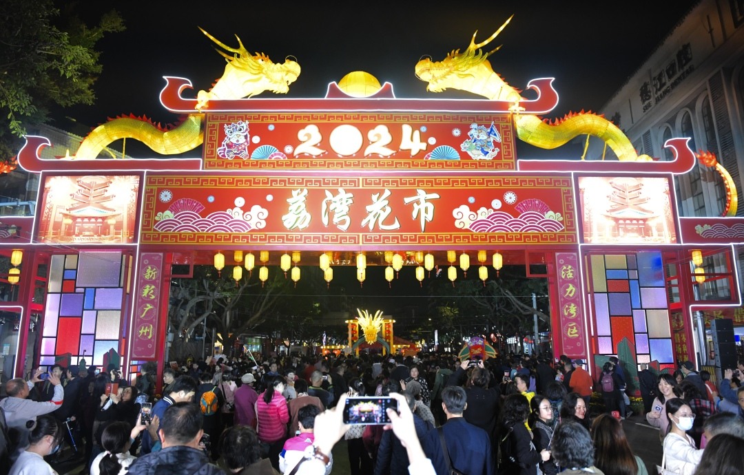 晚上七点半,在现场观众的见证下,在倒数声中,代表龙珠的圆球和南牌楼上方的龙珠联动点亮,带动牌楼上双龙、牌楼整体、荔湾路两边树上氛围灯及棚架顶上的灯依次亮起。荔湾区传统迎春花市牌楼及整体氛围灯光正式启动。