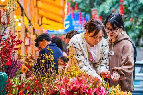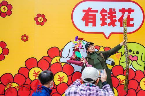 买到靓花的市民在花市一处背景墙前拍照打卡