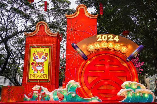 2024年海珠区迎春花市将于2月6日上午10:00正式开幕。2月5日,记者走访海珠花市主会场滨江花市,在现场,可以看到花市大部分装饰、摊档已准备就绪,一部分档主已入场摆好货品、预热开卖。不少市民也提前逛逛买买、拍照打卡。花市入口主牌楼、出口副牌楼均已搭建好,并开启了灯光,摆放着鲜花,等待明日的花市开锣。