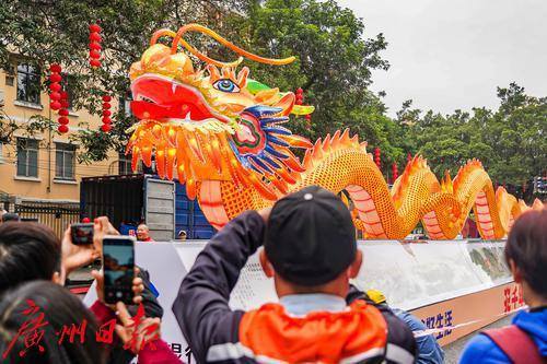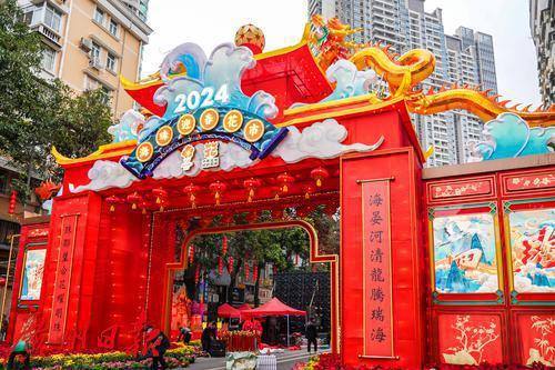 主牌楼后摆放了一条长长的巨龙装饰,生动威风,引得许多市民拍照