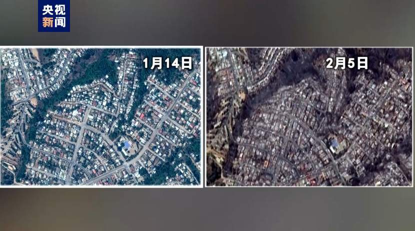 第二组卫星图片里,火灾之后,几乎看不到绿色的区域,部分房屋的轮廓模糊不清,这也就意味着这些房屋在大火中受到严重损毁。