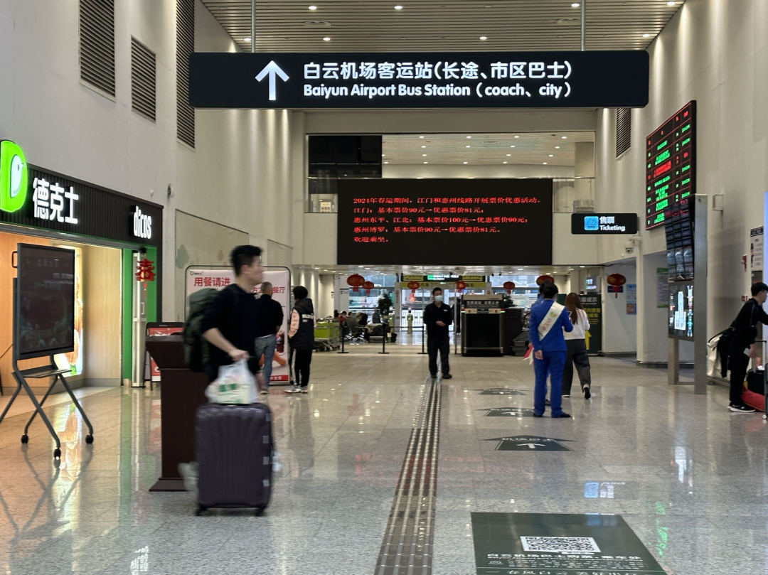 白云机场还在地铁夜间停运后,协调机场大巴兜底,只要有航班就有空港快线大巴,将旅客运送至市区,确保旅客顺利离开机场。