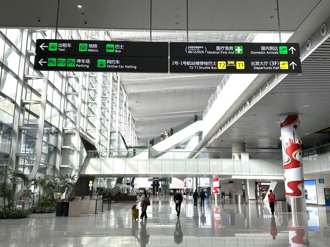 到达后,可从27号门进入T1航站楼一层,通过手扶梯或电梯前往三楼出发大厅、负一层A/B到达区。