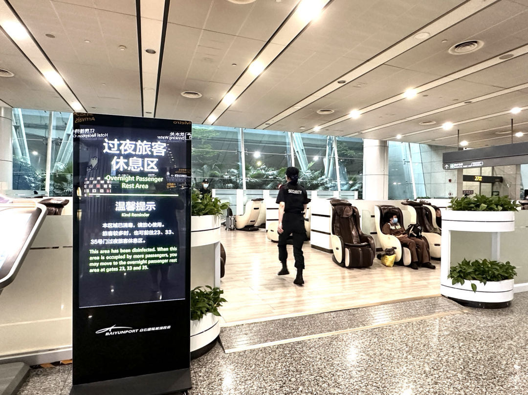 针对深夜抵达或等候凌晨航班的旅客,白云机场两座航站楼均设置过夜旅客休息区,让有需要过夜的旅客有一个舒适小憩的场所。白云机场T1航站楼共有4个免费休息区和1个收费的计时休息室,免费休息区分别位于出发厅一层的20号门、27号门、33号门、36号门,全天24小时开放;计时休息室位则于出发厅负一层地铁口旁,休息室睡眠舱内设有液晶电视、充电设备、无线网络等,同时免费提供行李寄存、热水卫浴、人工叫醒等服务。T2航站楼的免费休息区位于到达厅二层,每日21:00至次日8:00开放,设有躺椅、充电设施等。