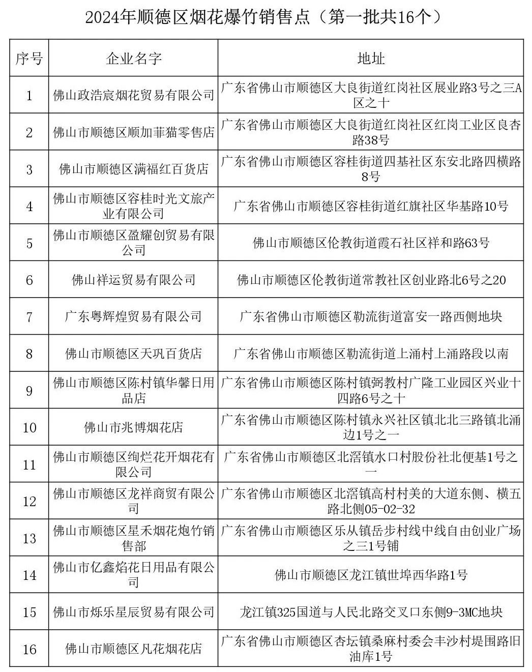 今年春节,佛山顺德的街坊可以燃放烟花爆竹了,但购买时要注意!记者从佛山市顺德区应急管理局获悉,该局还发布了今年第一批烟花爆竹销售点,共16个。