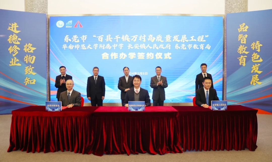 活动中,在阳成伟、郑国洪、冯彬、叶孔新、张锦庭的见证下,姚训琪代表华南师范大学附属中学、肖洪代表长安镇人民政府、叶淦奎代表东莞市教育局,三方签订合作办学协议。三方将发挥各自的资源优势,合作共建华南师范大学附属中学东莞长安学校,借助华南师范大学、华南师范大学附属中学先进教育思想与办学理念,推动长安镇基础教育优质均衡发展,优化全镇教育布局。