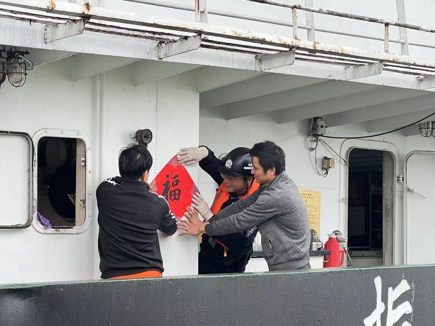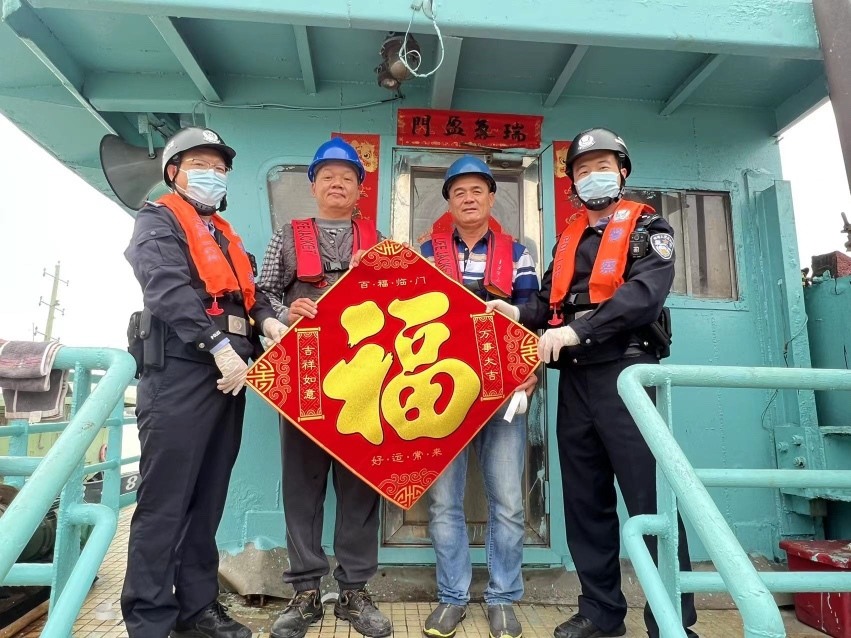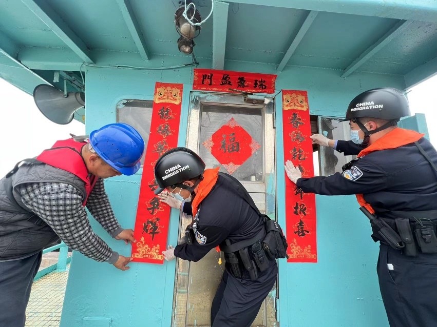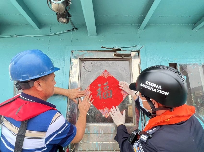 一线执勤民警们带着精心准备的春联和“福”字,登上靠泊在番港货运码头的一艘艘出入境船舶,为船员们送上真挚的新春祝福。移民管理警察与船员们一起贴春联、挂饰物,把船舱装饰得喜气洋洋,大家还你一言我一语地唠着家常,浓郁的年味溢满了整个船舱。