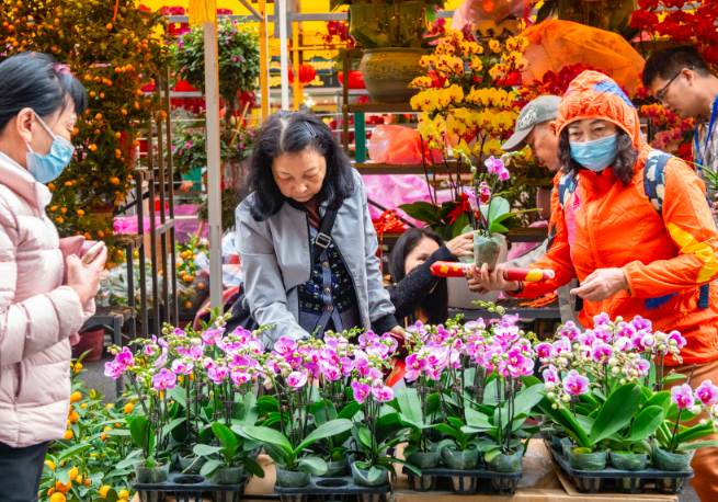 而花市的档口主要是花卉和非遗工艺品类。年花档口占了总数的90%。非遗档口引入了广绣、广彩、剪纸等非遗工艺。据悉,在非遗摊位,每日10时-12时都会有非遗大师在现场邀请市民一起体验非遗工艺。