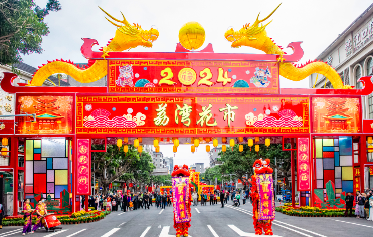 本次荔湾花市以“年富‘荔’强,花开‘湾’区”为主题,选址在荔湾路,寓意千年花香的荔湾区在2024年龙年蓬勃发展的愿景。旨在打造“传统花市+科技灯光+活动表演+非遗展示+高科技沉浸式互动体验”的新春欢乐嘉年华。
