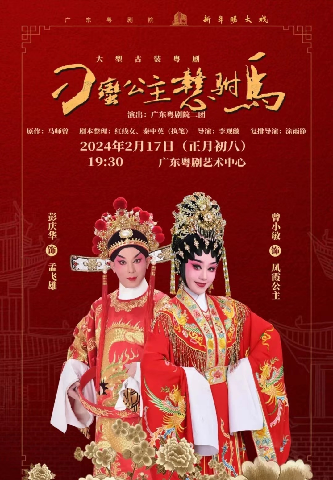 2月17日(年初八)上演的粤剧《刁蛮公主戆驸马》,描写的是皇帝女凤霞公主与三关主帅孟飞雄两个冤家斗智斗勇、几经波折,终成眷属的谐趣故事。