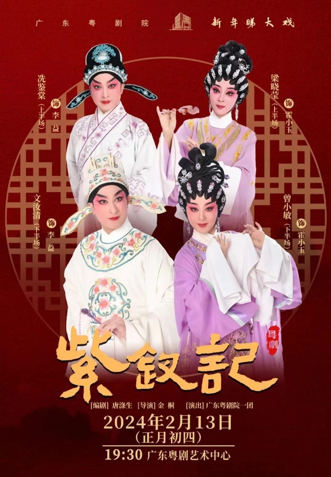2月13日(大年初四)上演的粤剧《紫钗记》,呈献唐代才子李益与歌伎霍小玉之间美好、曲折,最终“剑合钗圆”的爱情传奇。