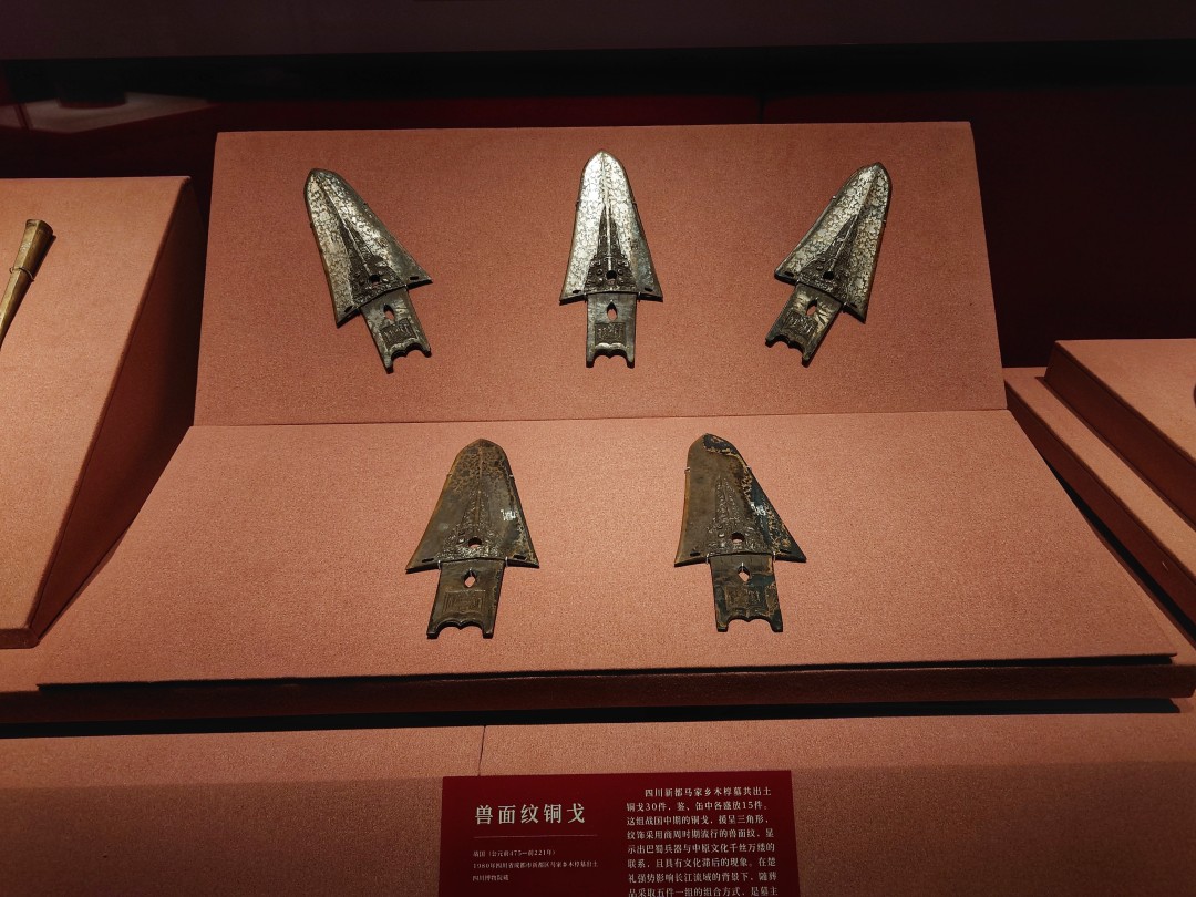 这组战国中期的铜戈,援呈三角形,纹饰采用商周时期流行的兽面纹,显示出巴蜀兵器与中原文化千丝万缕的联系,且具有文化滞后的现象。在楚礼强势影响长江流域的背景下,随葬品采取五件一组的组合方式,是墓主人对蜀地文化传统的恪守和坚持。