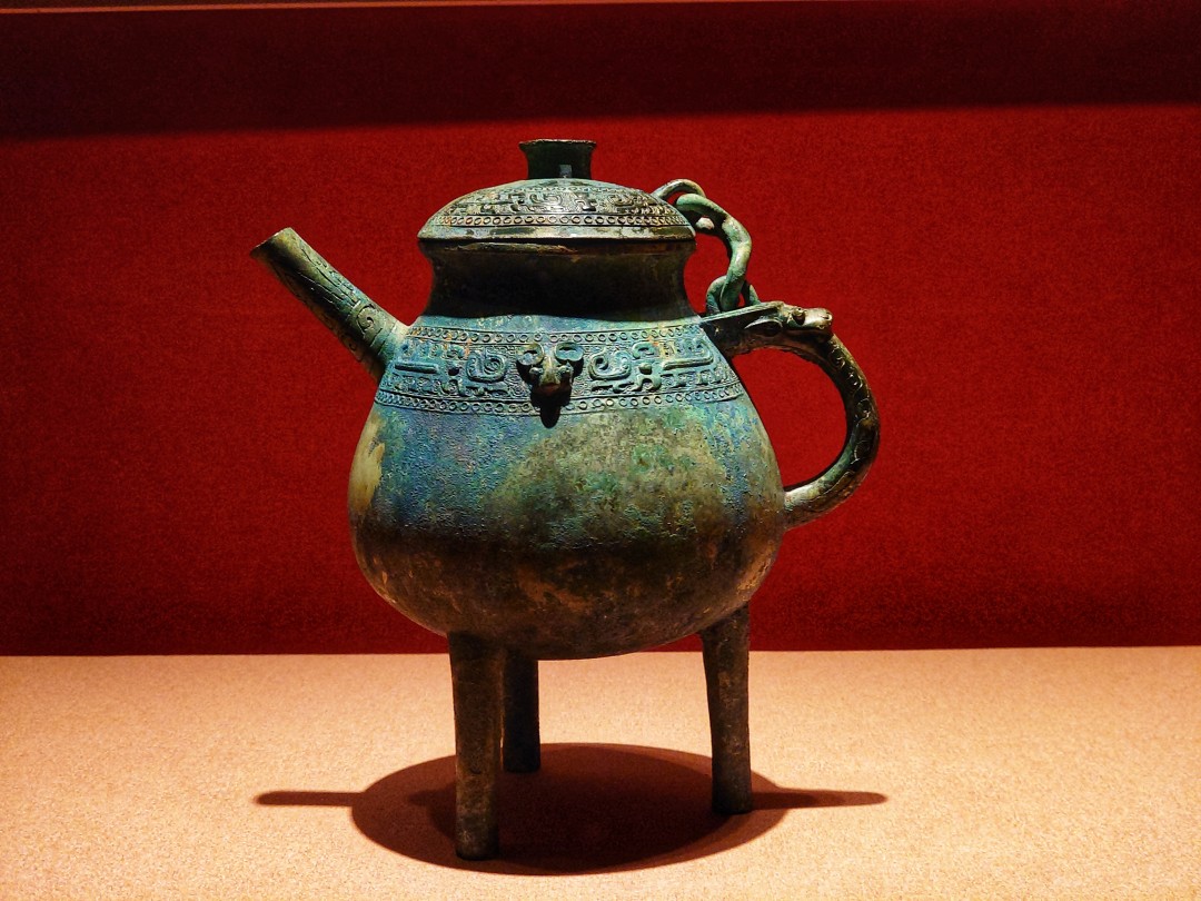 斝为盛酒器,也可温酒,商代盛行,多为王室和具有一定等级的贵族所用。此器只装饰有一条饕餮纹带,单层无底纹,是典型的商代早期装饰风格。李家嘴 1 号墓是一处高等级墓地,1974 年当地筑堤取土时被发现,虽然已遭破坏,但是随葬品极为丰富,其中酒器有 4 觚、3 爵、5 斝、1 壶、2 尊,从觚爵斝的套数来看,墓主人无疑是当时盘龙城的最高首领。
