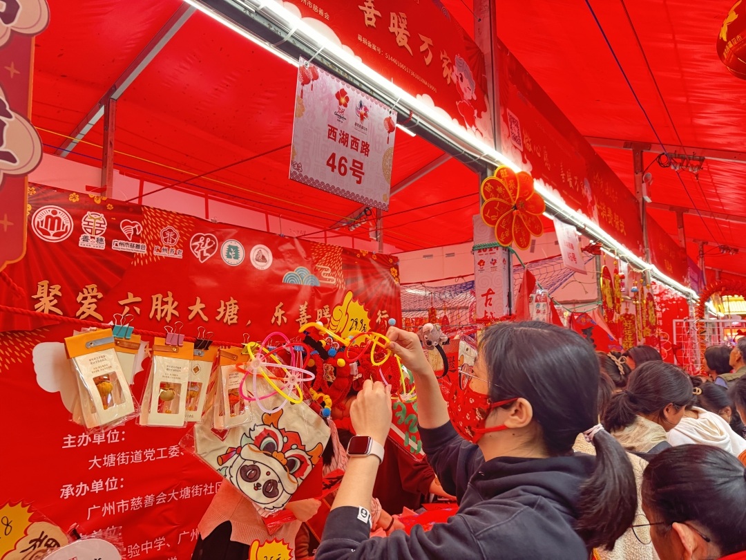 挥春、春节装饰品、冰箱贴、扇子等社区文创物品琳琅满目,同时各摊位还设有游戏互动、快闪体验等,吸引众多街坊驻足。广州市慈善会联合广州市越秀区慈善会邀请广州市慈善会大塘街社区慈善基金、广州市北京街社区慈善基金、越秀区慈善会太平通津社区慈善基金等多个社区慈善基金,齐齐助力,将家门口的慈善融入新春花市。