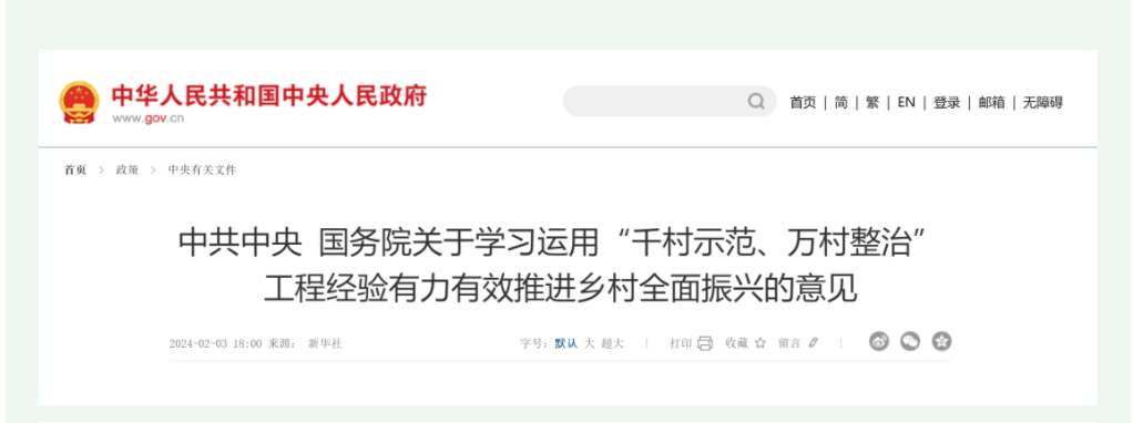 日前,2024年中央一号文件《中共中央 国务院关于学习运用“千村示范、万村整治”工程经验有力有效推进乡村全面振兴的意见》发布。