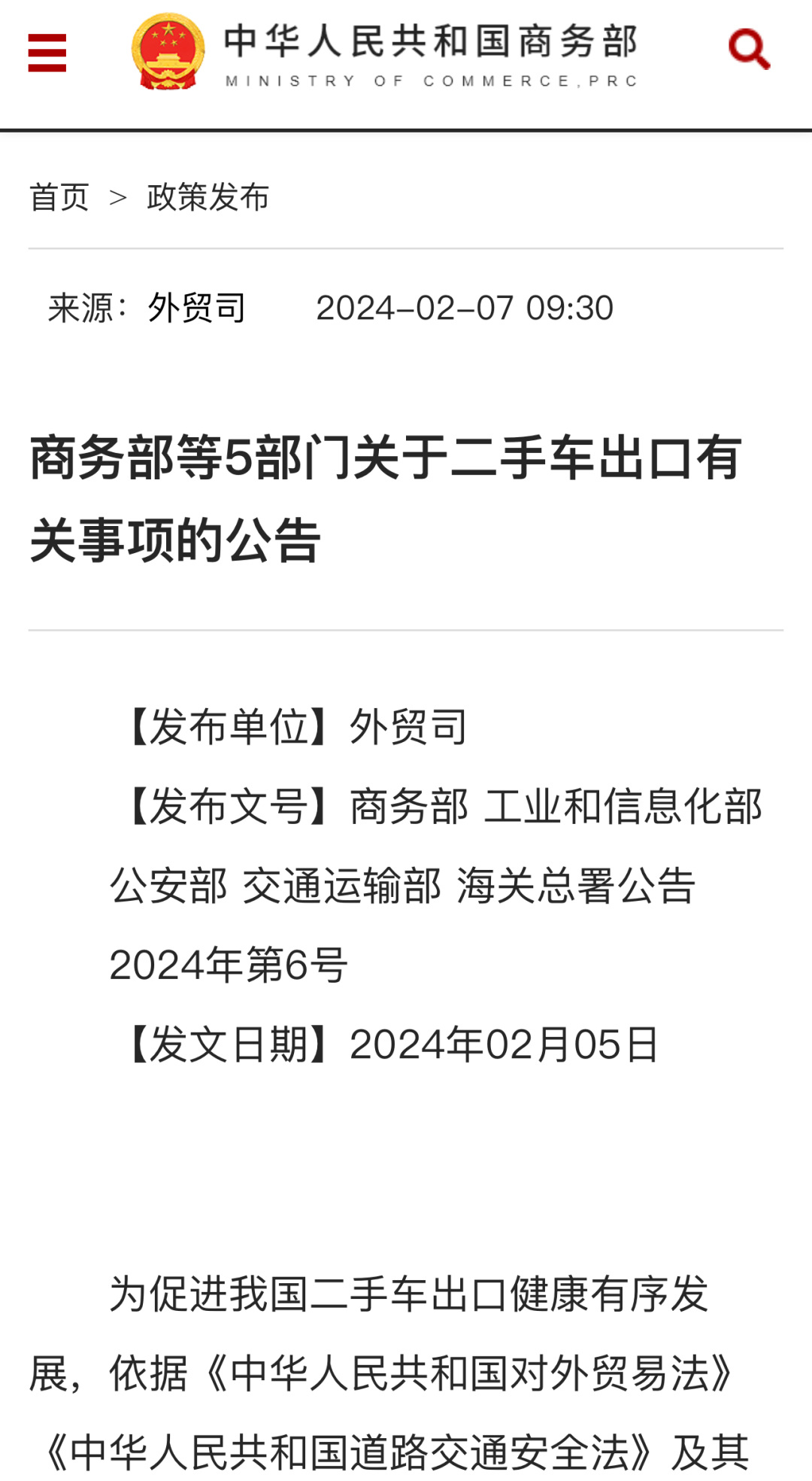 据商务部网站2月7日消息,商务部、工业和信息化部、公安部、交通运输部、海关总署日前联合制定了二手车出口有关要求和程序。公告将自2024年3月1日起施行。