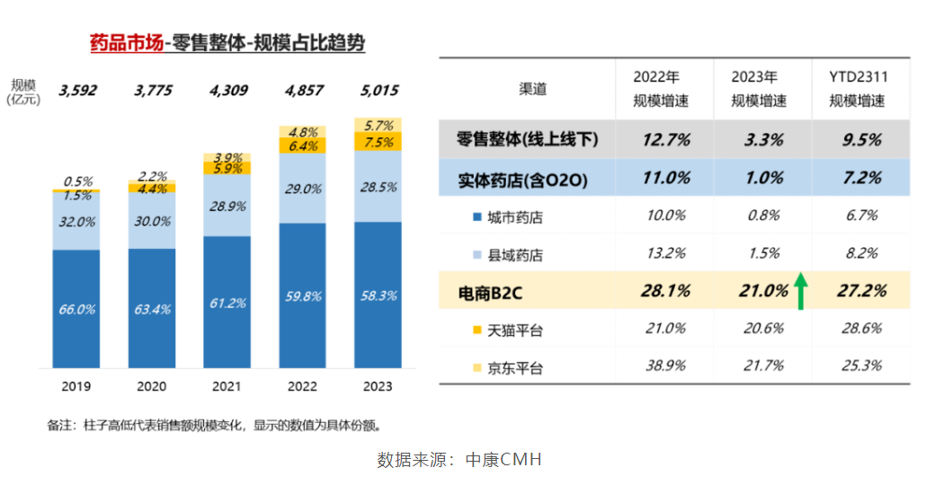 根据中康CMH数据,2023年中国医药零售市场的药品销售规模达到5015亿元,同比增长3.3%,其中实体药店(含O2O)2023年药品规模同比小幅增长1.0%,电商B2C增速达21.0%,远高于实体药店(含O2O)增速,渠道占比提升1.9%,渠道重要性进一步凸显。