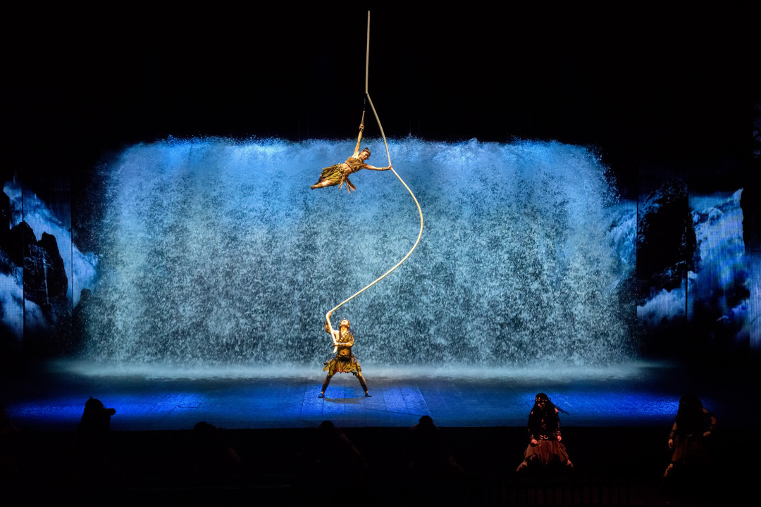 燃!熊熊烈火点燃人类文明的火把,千吨洪水瞬间倾泻而出,杂技演员于空中高速旋转起舞。正当观众惊讶感叹时,冼夫人的战马又于舞台间奔腾。黄飞鸿的一声“男儿当自强”慷慨激昂,燃起多少中华儿女的爱国情怀。海外游子声声“回家”情真意切,勾起多少人对故乡的思念,万封侨批从天而降,引起观众掌声一片。