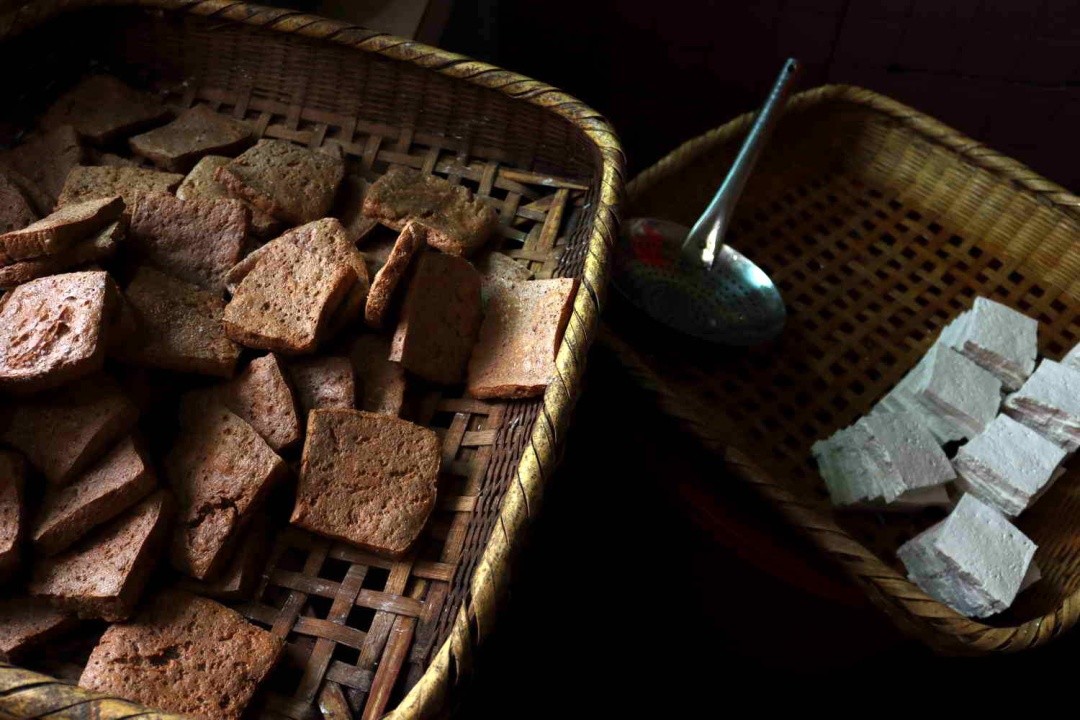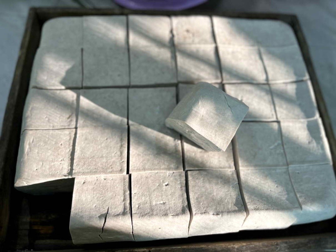 “花生豆腐主要是用花生枯混合黄豆豆浆制作而成,相比普通的黄豆豆腐,它颜色为灰白色,质地也较为坚硬,但风味却更有层次,油炸后可长期保存。”罗大姐一边忙碌着一边介绍。