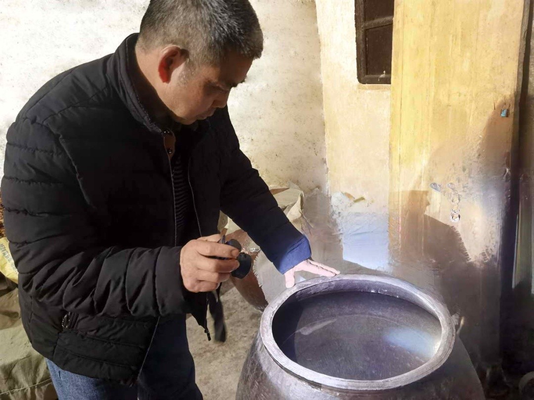 而在二十里开外的陈大伯家里,大家正忙着酿制另一非遗项目——标藤酒。该酒具有三百多年历史,由标藤作为酒曲发酵而成,有祛风除湿,活血消肿,行气止痛,化痰止咳之功效,深受当地村民喜爱。泡粮,初蒸,闷粮,摊凉,最后下标藤酒曲搅拌均匀后倒入蒸酒锅,通过文火缓缓加温,标藤酒就此而出。“沙坪以前很少稻米,所以标藤酒来之不易,尤为珍贵,只有逢年过节才会拿出来招呼重要客人。”陈大伯说道。