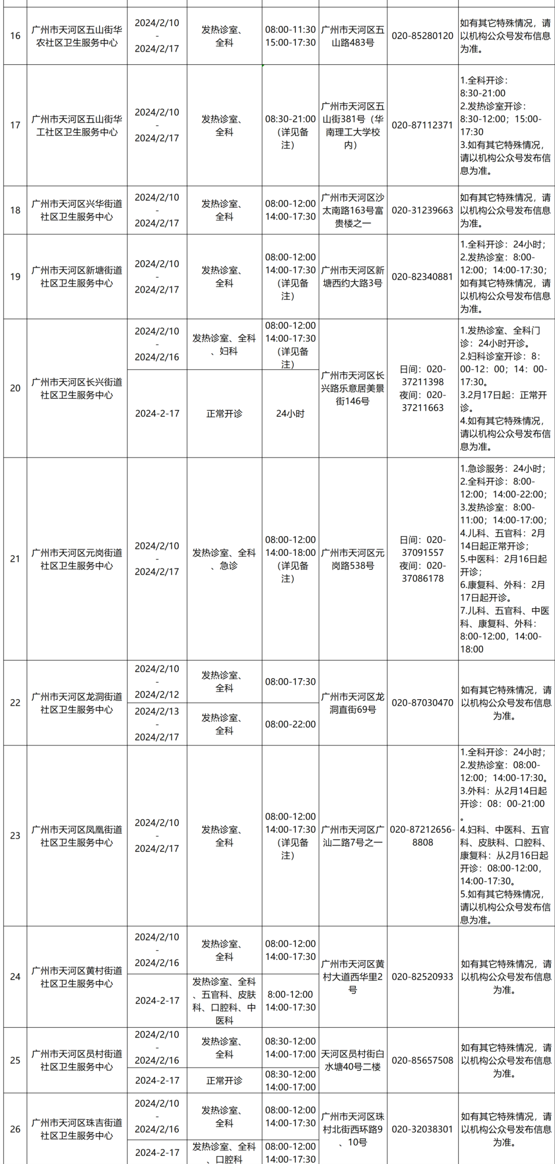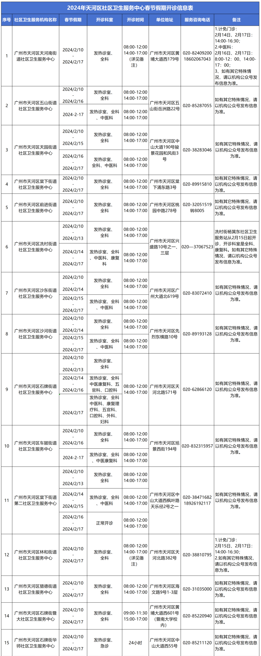 【2024年天河区社区卫生服务中心春节假期开诊信息表】