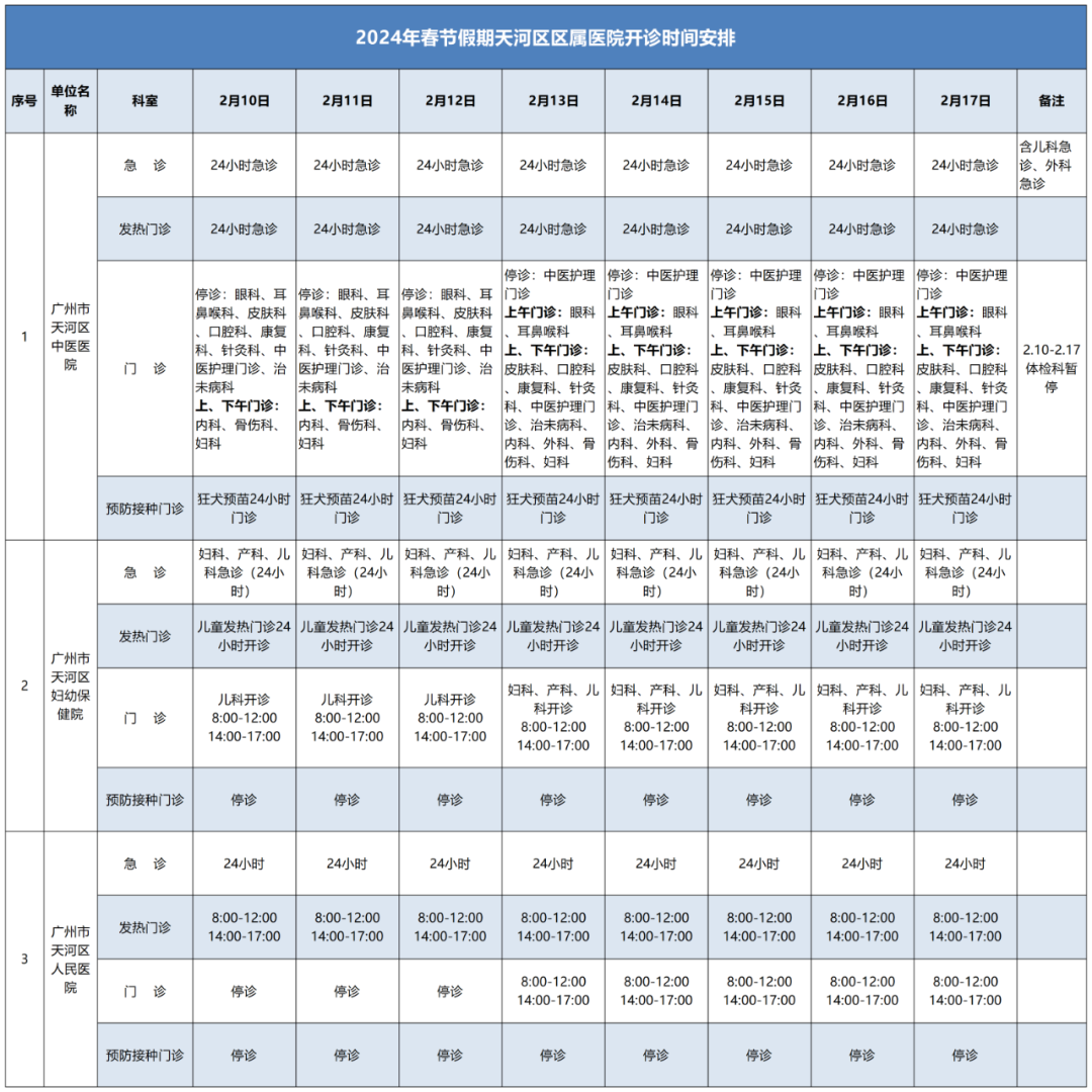 【2024年春节假期天河区区属医院开诊时间安排】