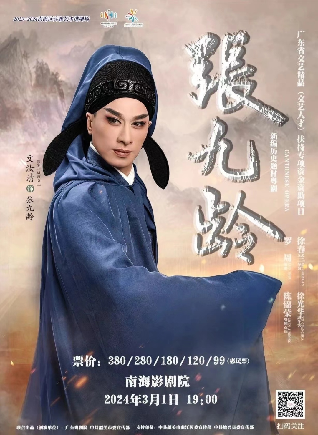 3月1日、2日,广东粤剧院一团文汝清、冼鉴棠、吴泽东、梁晓莹、严金凤、苏国进、钟翰宁等名家新秀将在佛山市南海影剧院呈献粤剧《张九龄》和《观音情度韦陀天》两台精彩大戏。粤剧《张九龄》由文汝清担纲主演,讲述的是一代名相张九龄排除万难开凿梅关驿道的故事;粤剧《观音情度韦陀天》由文汝清、梁晓莹领衔主演,该剧舞台华丽宏大,服装精美别致,音乐悦耳悠扬,深受观众喜爱。