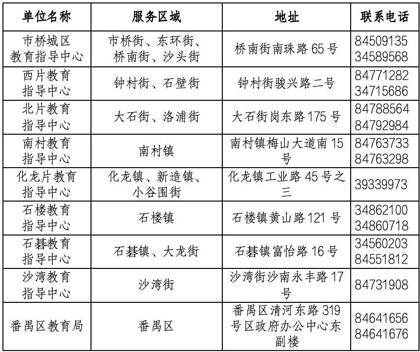1.市桥学区(市桥街、沙头街、东环街、桥南街):番禺中学附属学校、市桥中心小学、富都小学、南阳里小学、市桥实验小学、新世纪小学、番禺区实验中学、东风中学、市桥侨联中学、桥城中学、星海中学、桥兴中学。