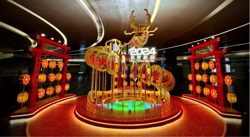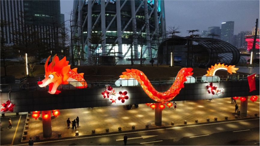 新春美陈点缀“年味”广州塔。为营造浓厚的新春节日氛围,广州塔精心打造美陈装饰及全塔氛围布置,在首层登塔大厅增设灵动璀璨的“祥龙戏珠”造型新年装饰,展现中华文化的博大精深,祈愿新的一年龙腾虎跃、龙马精神。聚焦“行花街”传统民俗活动,以创新形式展现巨型木棉花在广州塔“盛开”情景,伴随祥龙环绕,配合广州塔景区内随处可见的桃花、年桔、灯笼装饰,把“行花街”这一广府精神印记融入地标,将“龙精神”这一重要象征在地标传承,让“老民俗”在广州塔焕发“新活力”。
