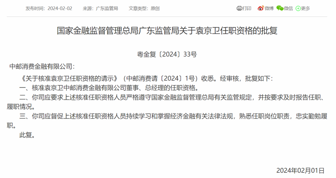 近日,国家金融监督管理总局广东监管局发布《关于袁京卫任职资格的批复》,核准袁京卫任中邮消费金融有限公司(下称“中邮消费金融”)总经理的任职资格。