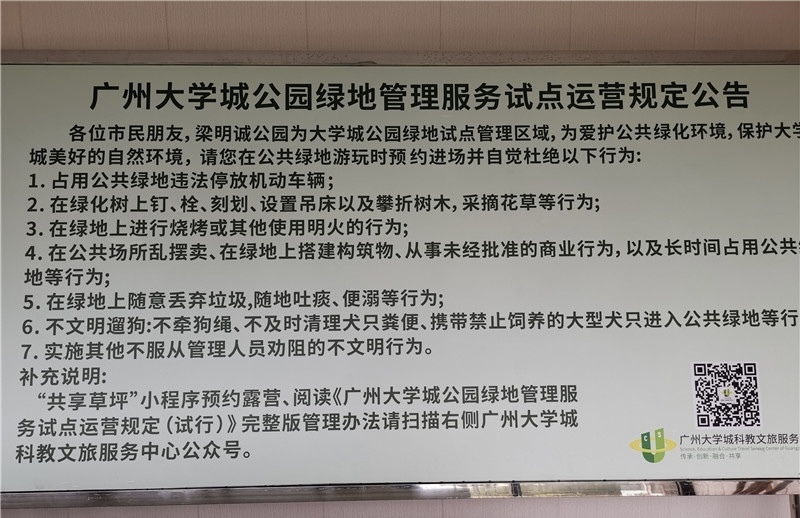 广州大学城科教文旅服务中心负责人万丹琛告诉记者,广州大学城公园绿地开放共享试点于2023年12月9日正式启动,广州大学城管委会根据试点工作要求,委托广州大学城科教文旅服务中心开展进场预约、服务提升、规范管理、不文明劝导等场地运营工作,充分满足市民游客亲近自然、休闲游憩、运动健身等需求;同时制定草坪轮换养护管理等制度,交替开展草坪开放共享,确保草坪健康生长、景观优美。