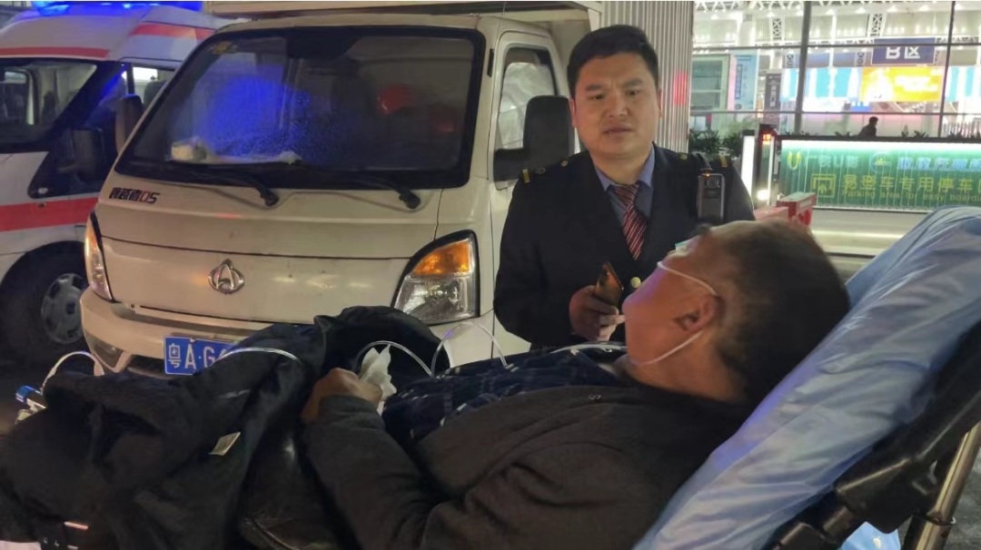 在焦急的等待中,1时15分,救护车到达现场,杨棣带领医护人员快速进站,两名医生在众人帮助下将哮喘旅客扶上担架,并为旅客进行吸氧、保暖等救护措施。杨棣拿起旅客20来斤的行李一路护送到站外,叮嘱旅客先安心配合医院治疗,旅客摆手致谢。直到救护车驶离,杨棣心里的石头才终于落了地。
