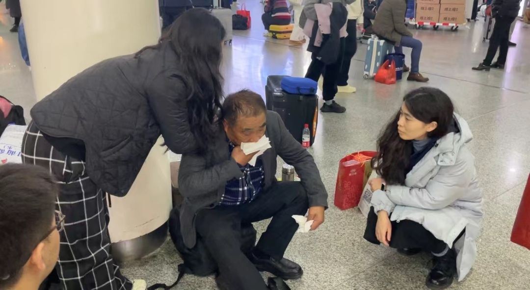 8日0时56分,客运员胡丹妮和刘默贤正紧张地进行春运通宵列车检票作业,突然发现闸机前一名旅客脸色不对,手不停比划着。胡丹妮立马用对讲机呼叫客运值班员杨棣:“有旅客突发疾病……”2分钟后,杨棣迅速前来察看,发现该旅客面色泛黄,询问时不停张嘴喘气,想说话却只能发出沙哑的“啊啊”声,喉咙深处翻涌起“咕噜咕噜”的卡痰声。