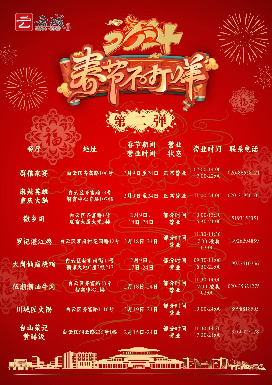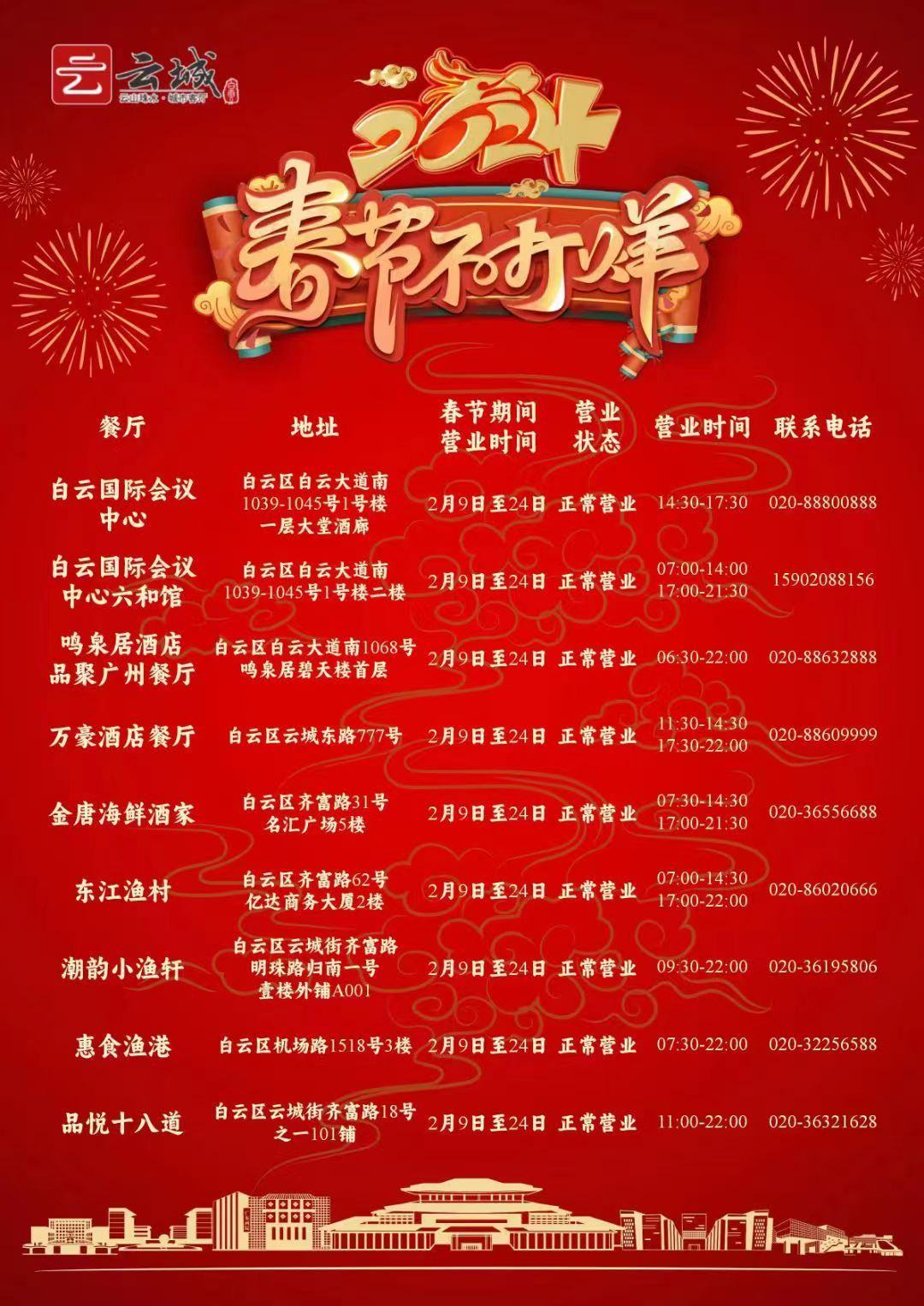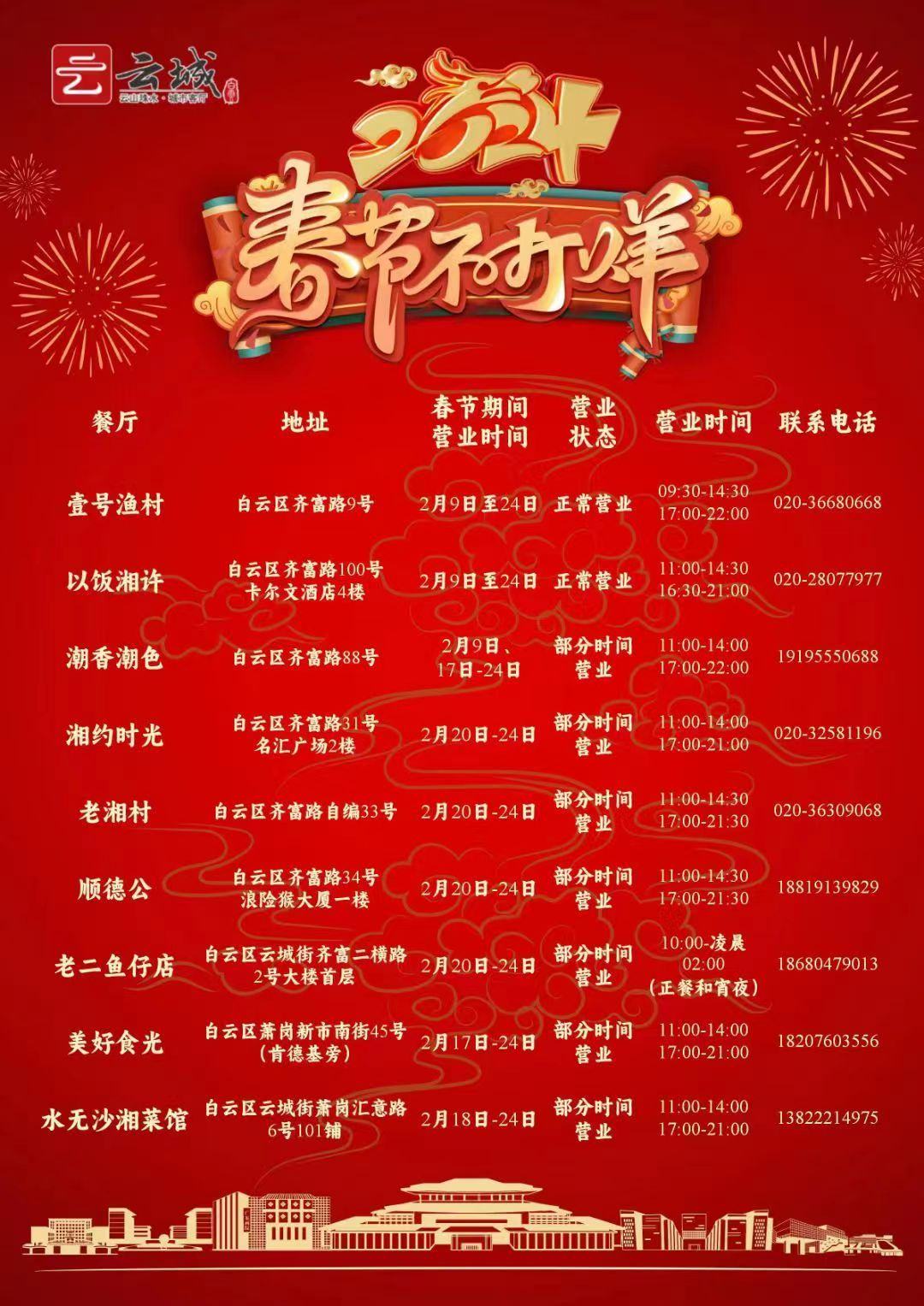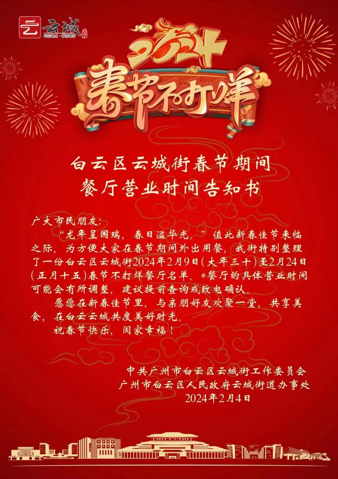 近日,广州市白云区云城街党工委、云城街道办事处发布《白云区云城街春节期间餐厅营业告知书》,搜集整理了辖内春节期间“不打烊”的餐厅名单,方便群众春节期间外出用餐,让大家共享好“食”光。