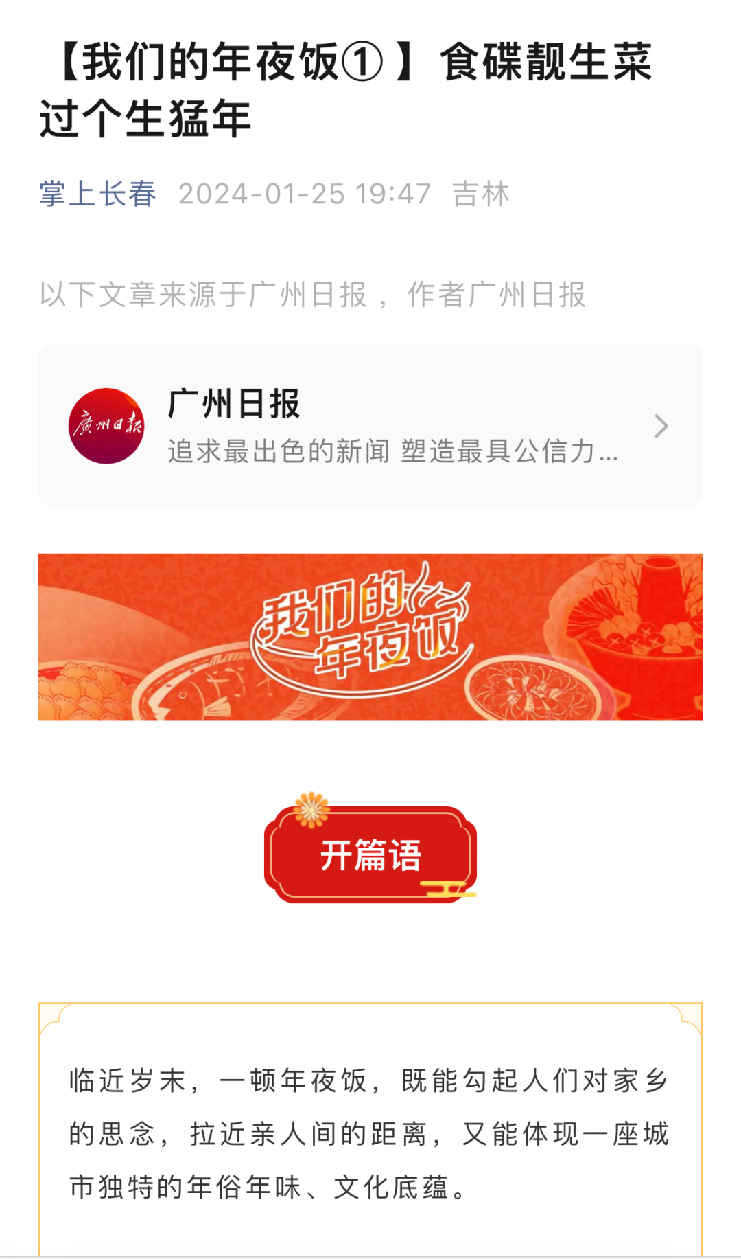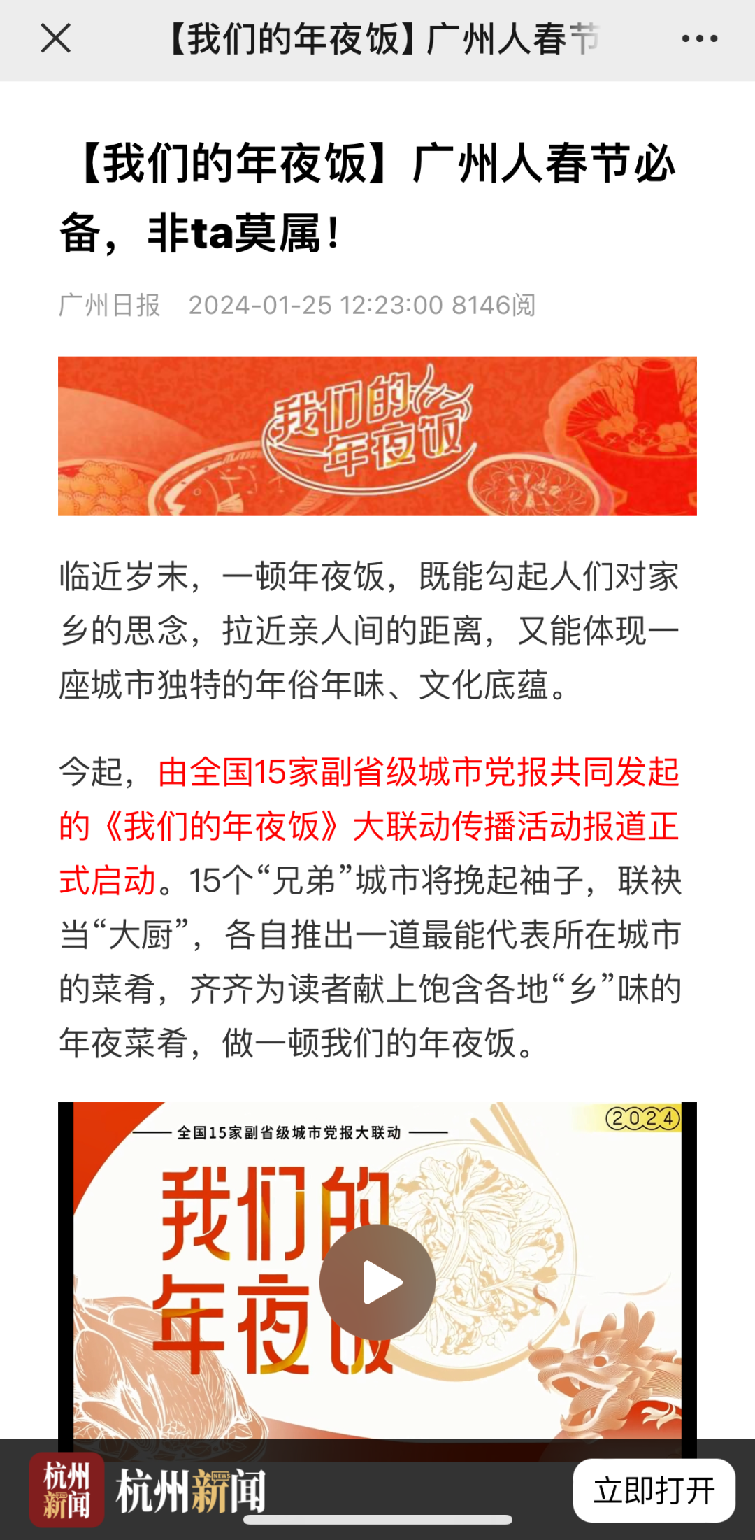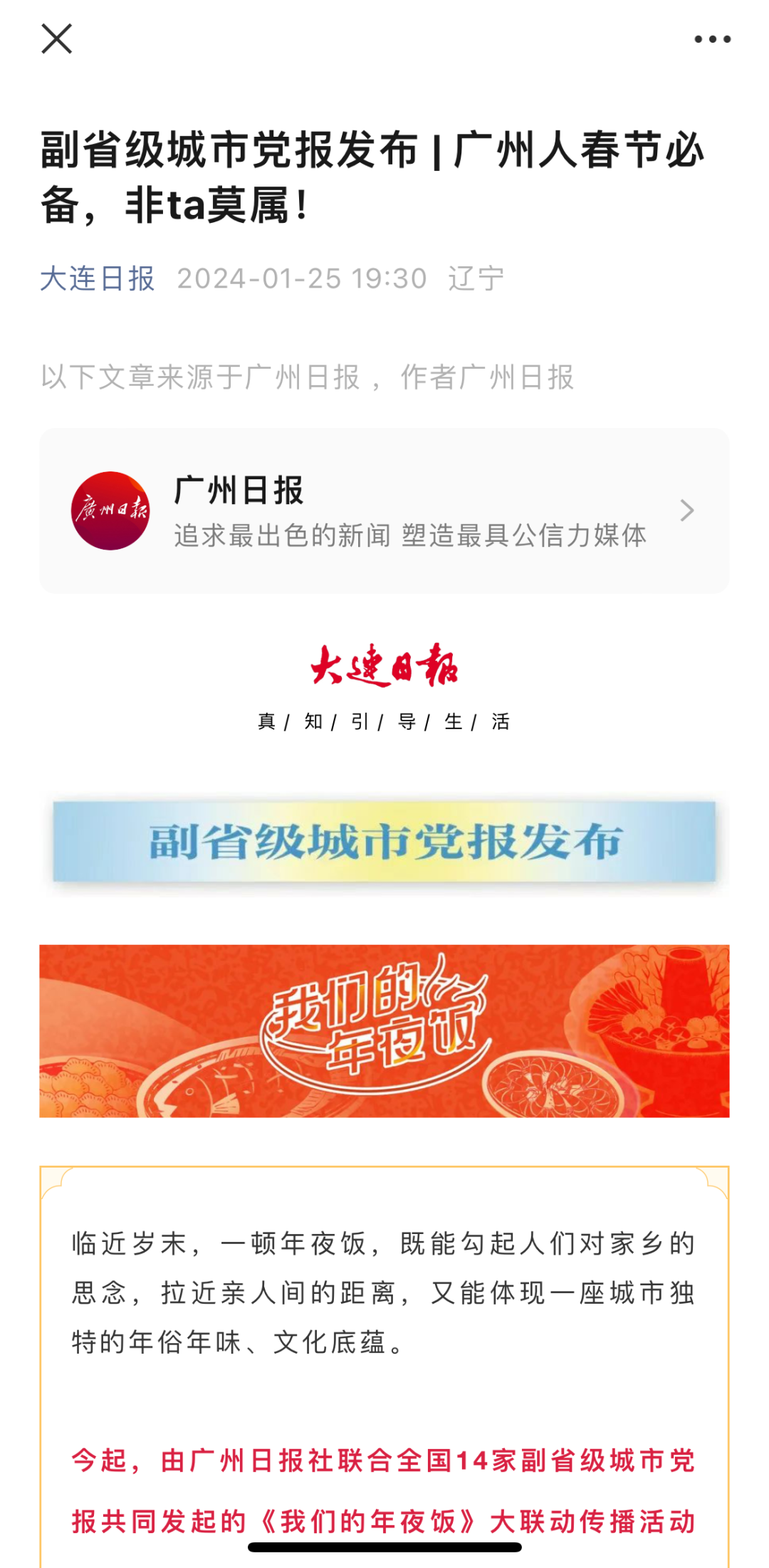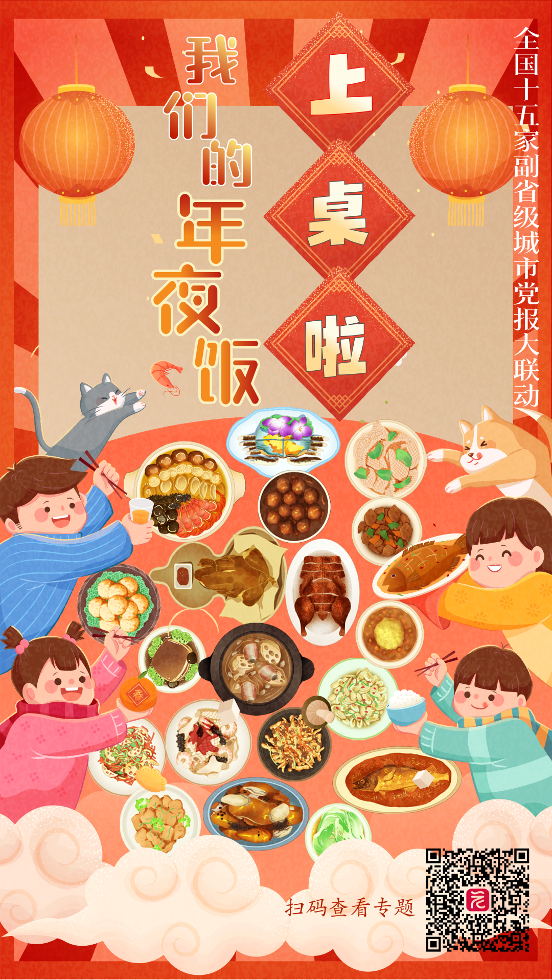 1月25日,广州日报倡议发起“15家副省级城市党报联动之‘我们的年夜饭’”联合报道。报道历时15天,跨越祖国的大江南北。从东北大地到珠江之畔,从东海之滨到天府之国,有哈尔滨的锅包肉、沈阳的“四绝菜”、长春的辣焖明太鱼、大连的海味全家福,也有广州的生菜煲、盆菜、深圳的发菜蚝豉焖猪手;有济南的章丘大葱虾肉丸、青岛的辣炒蛤蜊、南京的素什锦、杭州的酱鸭、宁波的红膏炝蟹,也有西安的葫芦鸡、武汉的排骨藕汤、成都的鱼香肉丝。尽管菜式味道不一,却饱含15座城市人们对于生活的懂和爱,是让人魂牵梦绕的家的味道。