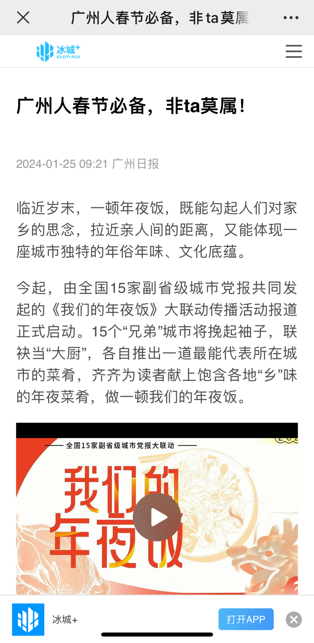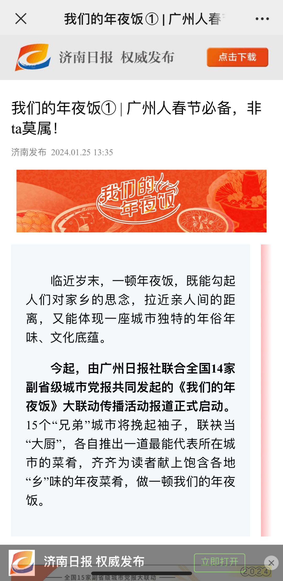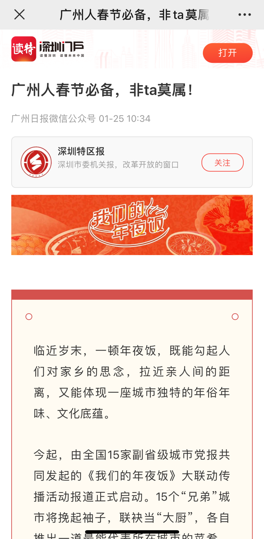 1月25日,广州日报倡议发起“15家副省级城市党报联动之‘我们的年夜饭’”联合报道。报道历时15天,跨越祖国的大江南北。从东北大地到珠江之畔,从东海之滨到天府之国,有哈尔滨的锅包肉、沈阳的“四绝菜”、长春的辣焖明太鱼、大连的海味全家福,也有广州的生菜煲、盆菜、深圳的发菜蚝豉焖猪手;有济南的章丘大葱虾肉丸、青岛的辣炒蛤蜊、南京的素什锦、杭州的酱鸭、宁波的红膏炝蟹,也有西安的葫芦鸡、武汉的排骨藕汤、成都的鱼香肉丝。尽管菜式味道不一,却饱含15座城市人们对于生活的懂和爱,是让人魂牵梦绕的家的味道。