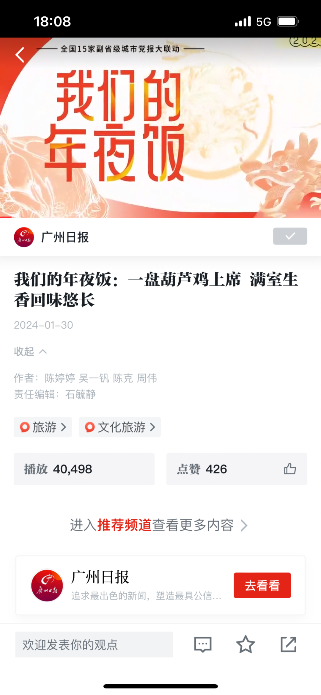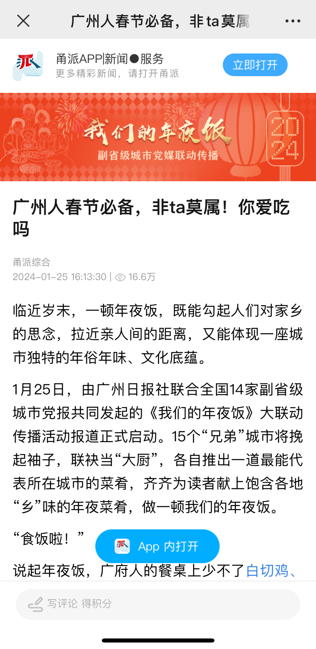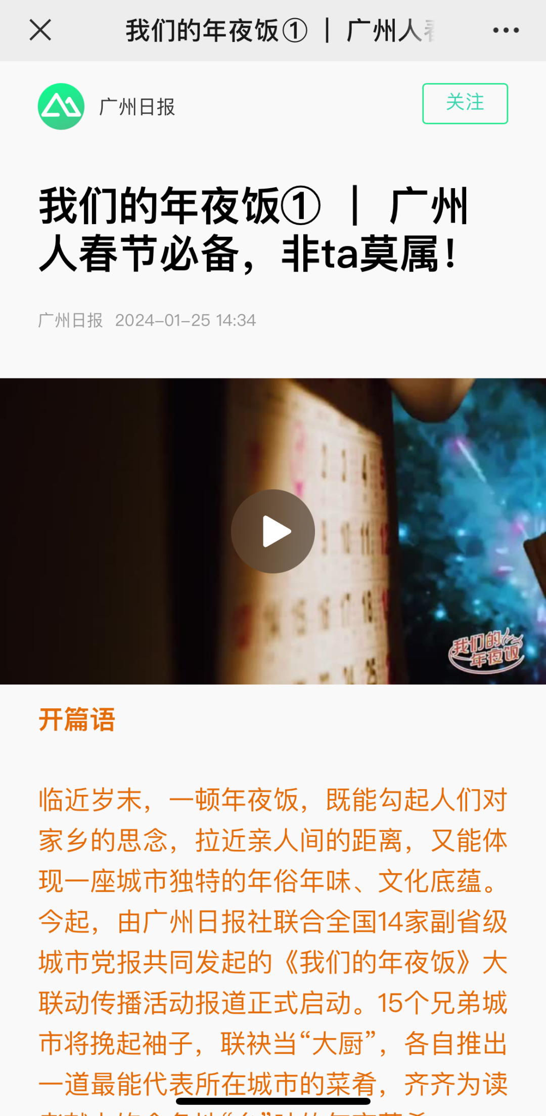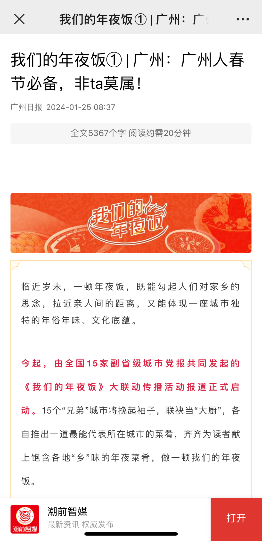1月25日,广州日报倡议发起“15家副省级城市党报联动之‘我们的年夜饭’”联合报道。报道历时15天,跨越祖国的大江南北。从东北大地到珠江之畔,从东海之滨到天府之国,有哈尔滨的锅包肉、沈阳的“四绝菜”、长春的辣焖明太鱼、大连的海味全家福,也有广州的生菜煲、盆菜、深圳的发菜蚝豉焖猪手;有济南的章丘大葱虾肉丸、青岛的辣炒蛤蜊、南京的素什锦、杭州的酱鸭、宁波的红膏炝蟹,也有西安的葫芦鸡、武汉的排骨藕汤、成都的鱼香肉丝。尽管菜式味道不一,却饱含15座城市人们对于生活的懂和爱,是让人魂牵梦绕的家的味道。