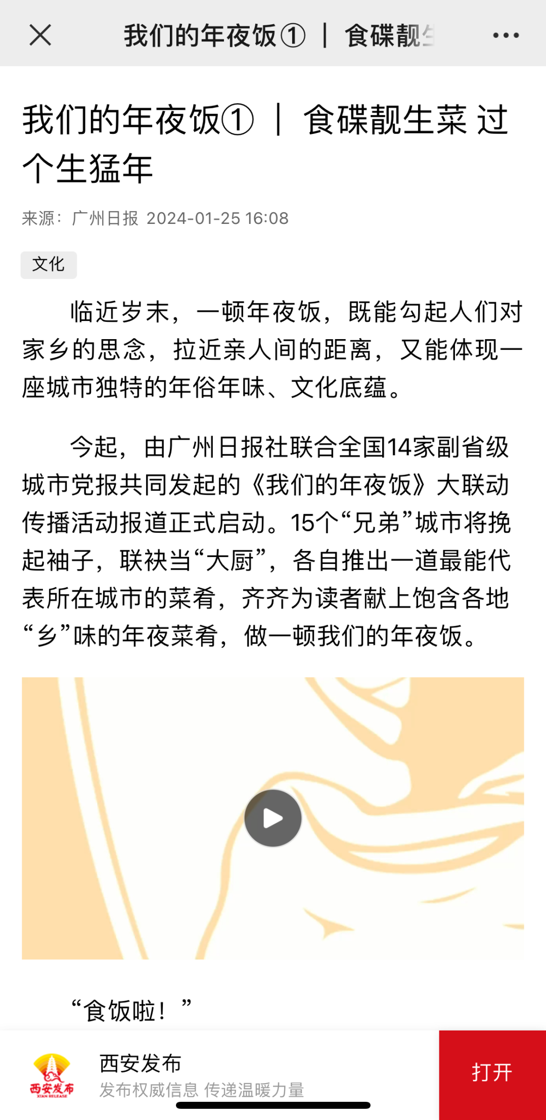 尤其是各家新媒体传播队伍,纷纷拿出绝活,用镜头介绍城市菜肴的“顶流”,介绍城市的文化风采。短视频各有各的特色,各有各的创意,各有各的好看,还频频被学习强国平台选用,在更大范围内向全国人民宣传“我们的年夜饭”,总播放量超十万级。其中,西安选送的“我们的年夜饭:一盘葫芦鸡上席 满室生香回味悠长”短视频,更获得学习强国总台首页推荐,播放量超四万。
