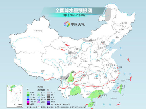 明天,内蒙古中部和东北部、川西高原南部、云南西北部等地部分地区有小雪或雨夹雪,其中,川西高原南部等地部分地区有中到大雪(5~8毫米)。四川盆地西南部、云南东部、广西东部和西部、广东中西部、海南岛、台湾岛大部等地部分地区有小雨。